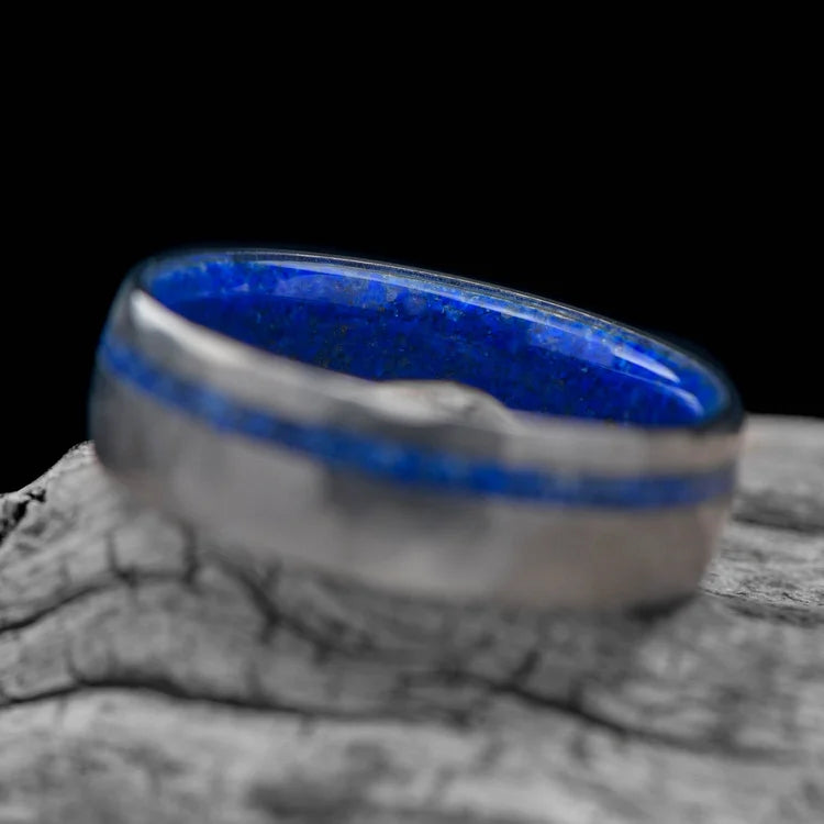 Faceted titanium wedding band with lapis lazuli inlay on a white sea branch, 7mm mens domed ring, unique custom design, free engraving available.