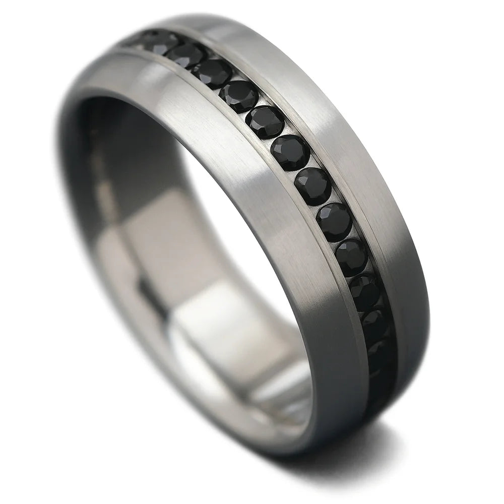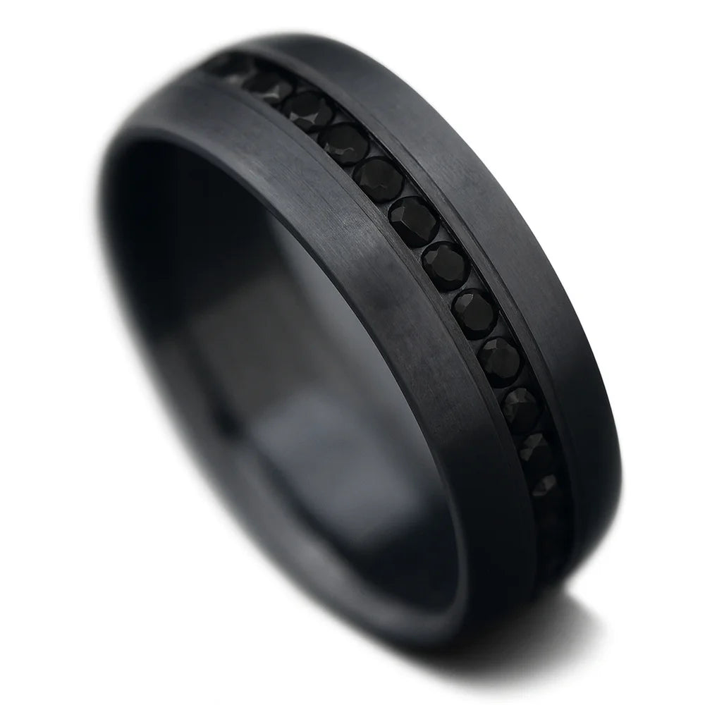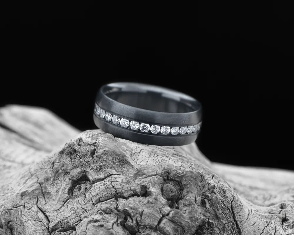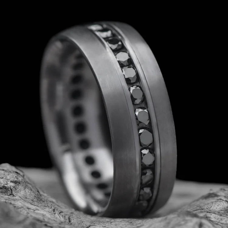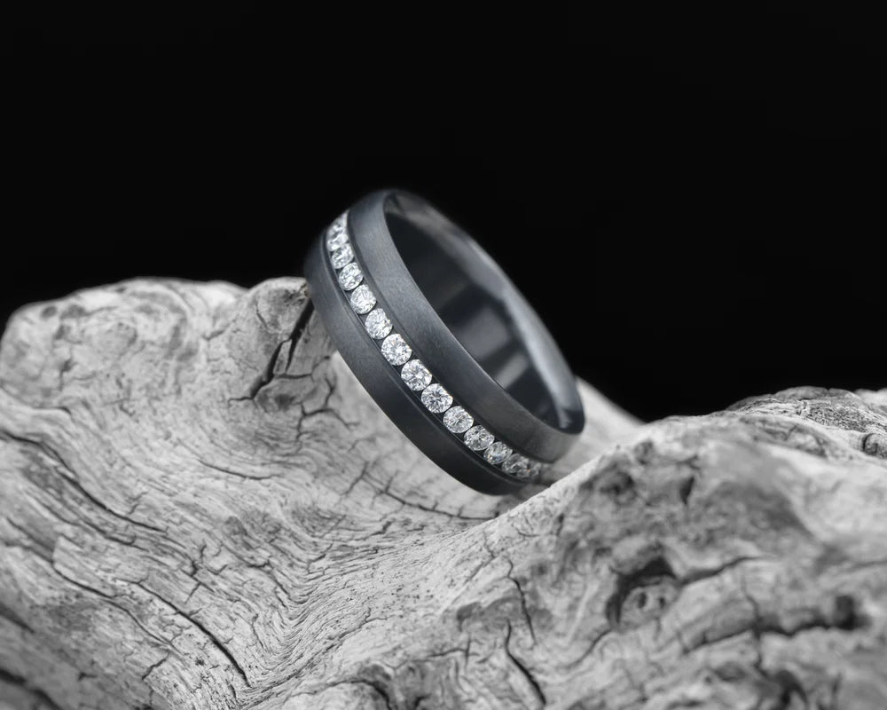 Our rings use unique materials like carbon fiber, whiskey barrel wood, meteorite, opals, jade, lapis lazuli, and even personal items like sand, shells, or heirloom metals. Each ring tells your story.